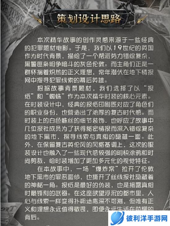灵感来源:本次时装的创作灵感来源于经典的犯罪题材电影,结合19世纪的英国时代背景,营造了一个帮派势力错综复杂、黑警匪枭明争暗斗的灰色伦敦。主角们是一群怀揣正义理想的幕后英雄,潜伏在地下情报网中搜寻犯罪线索。