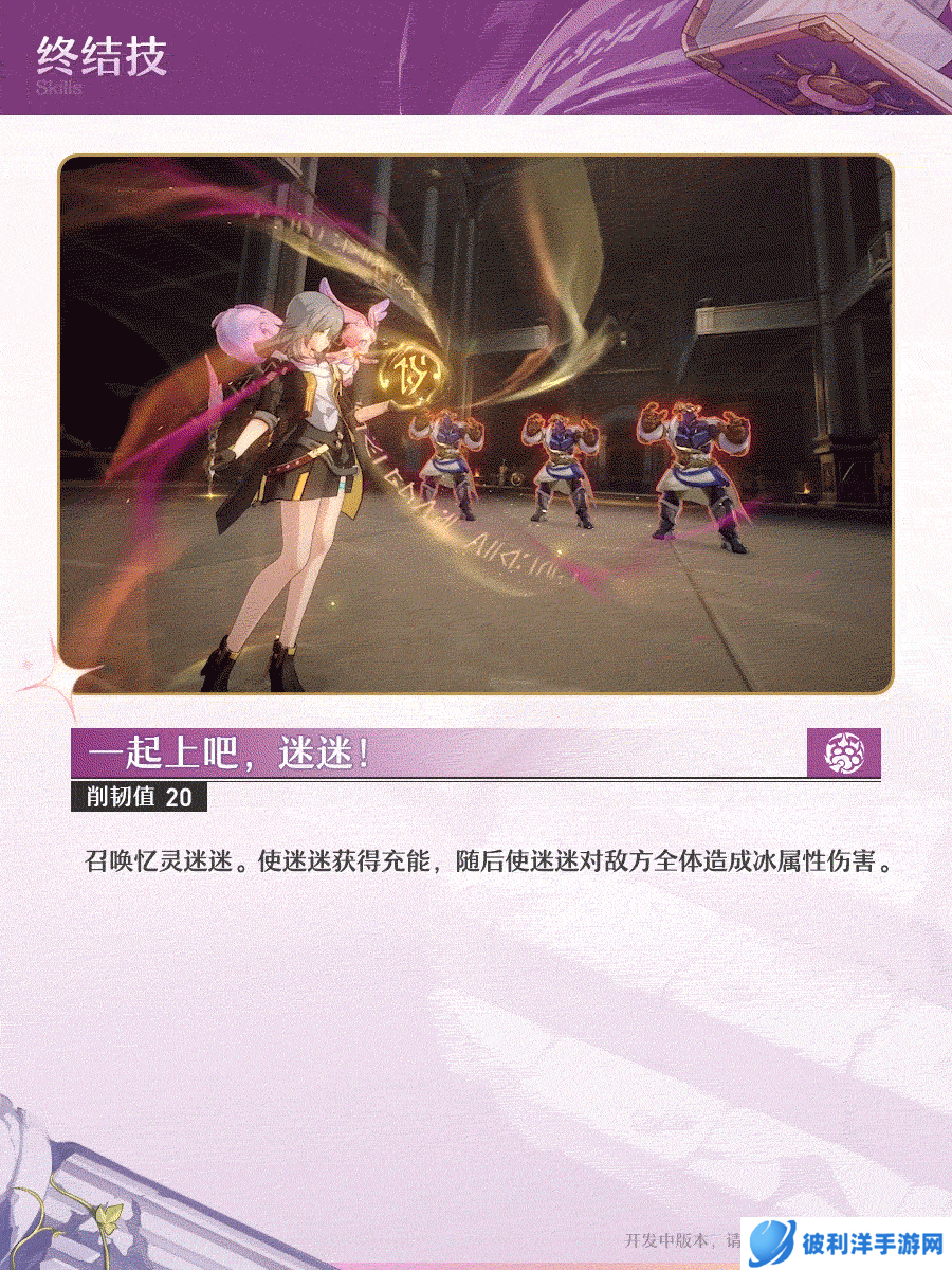 终结技“一起上吧,迷迷!”不仅再次召唤迷迷,还会使迷迷获得充能,之后对所有敌方单位造成大量冰属性伤害,同时削减20点韧性。这是一个强大的群体控制技能,可以在关键时刻扭转战局。