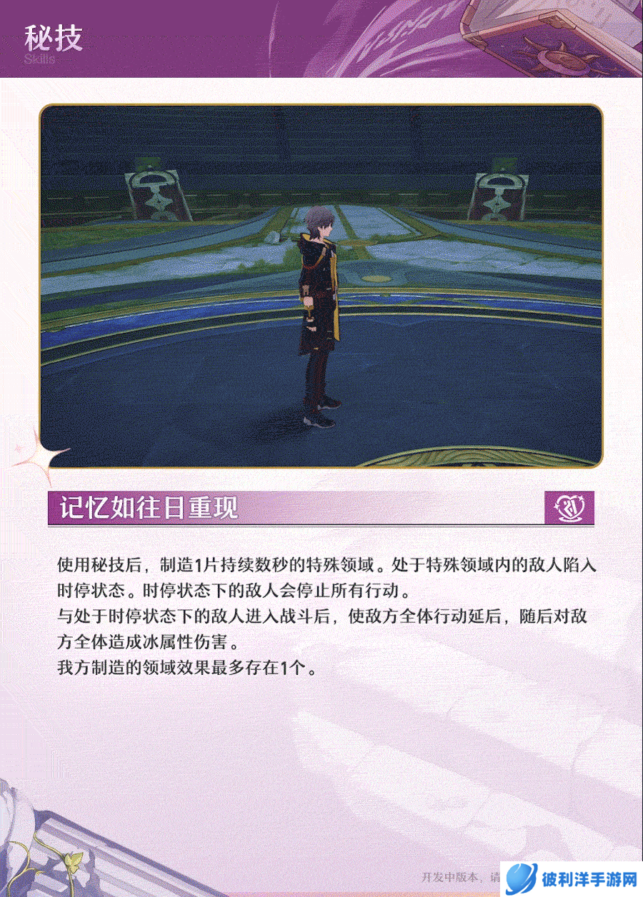 秘技“记忆如往日重现”创造一个短暂的特殊领域,使领域内的敌人陷入时停状态。当与这些敌人交战时,不仅可以延迟他们的行动,还会对他们造成额外的冰属性伤害。该技能对于打断敌人的连续攻击或者设置战术优势非常有用。