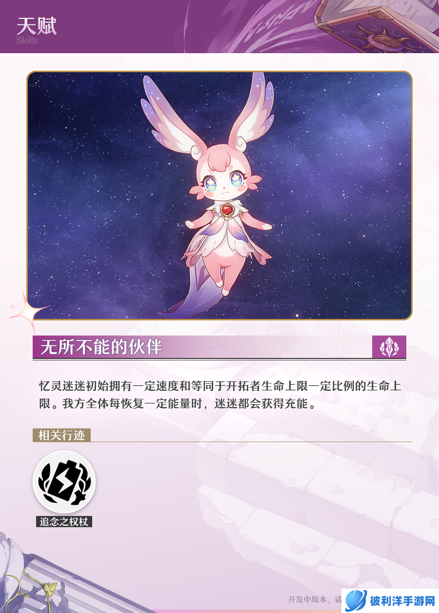 天赋技能让迷迷拥有初始速度和一定比例的生命上限,基于开拓者自身的生命值。每当队友恢复能量时,迷迷也会获得充能,这使得它可以频繁地参与战斗并施放技能。