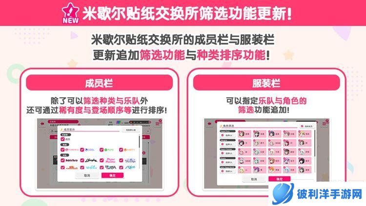 米歇尔贴纸交换所的筛选功能更新,让玩家在兑换成员和服装时更加方便快捷,可以根据自己的需求进行筛选和排序。