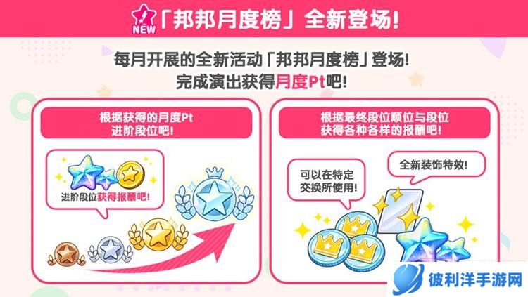 在玩法方面,【邦邦月度榜】全新上线。每月参与演出即可获得月度Pt,并且有青铜、白银、黄金、铂金四个段位供玩家挑战。每当到达新的段位,玩家都能获得相应的升段报酬和排行报酬,包括特殊的月度奖牌,可以在邦邦月度榜交换所中兑换各类道具,为玩家的游戏之旅增添更多乐趣和动力。