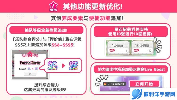 除了上述功能更新,游戏还进行了其他优化。全新编队等级追加,乐队综合评分和评价值在评级SS5之上新增了SS6~SSS的评级,玩家可以通过完成角色任务更快地提高编队等级。星石招募券也新增了10连招募功能,虽然使用星石招募券进行的10连招募不会必定出现★3以上成员,但为玩家提供了更多的招募选择。协力演出的部分界面中还新增了显示剩余LiveBoost点数的功能。
