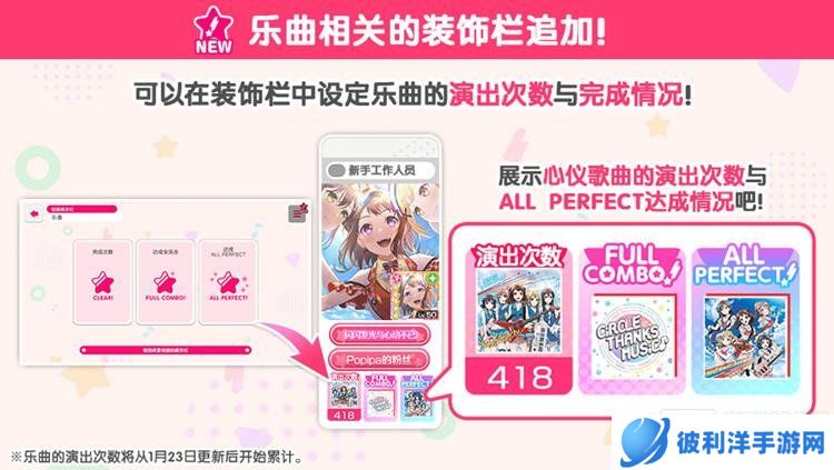 此外,游戏还新增了全新的装饰展示栏目。玩家可以在个人资料中展示所选歌曲的演出次数与完成情况,这下哪首歌打了多少次都能被放出来了。