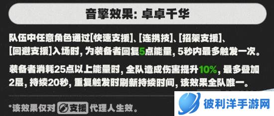 队伍中任意角色通过[快速支援】、【连携技]、招架支援][回避支援]入场时,为装备者回复5点能量,5秒内最多触发一次。装备者消耗25点以上能量时,全队造成伤害提升10%,最多叠加2层,持续20秒,重复触发时刷新持续时间,该效果全队唯一。