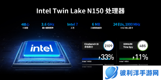 据介绍,TwinLakeN150 处理器拥有 4 核 4 线程、睿频 3.6GHz,采用 Intel 7 工艺,相比上一代AlderLake-N N100 的 Cinebench23 多核性能提升 33%、3DMark 性能提升 11%。