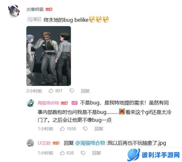 海猫络合物无奈回应道:“这不是BUG,是我特地提的需求!”他还透露,尽管这段动画效果并非BUG,但在游戏内的测试过程中,确实有同事在看到这一幕时误以为是BUG。海猫表示:“看来这个GIF还是太冷门了,之后我会让它看起来更不像BUG一点。”