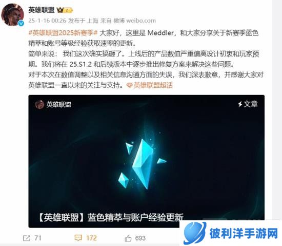 在英雄联盟新赛季中,官方对蓝色精粹获取进行了调整,目的是希望新玩家和休闲玩家能够有更显著的增长。但取得的效果却不尽人意,引发了玩家的热议,近日,《英雄联盟》官方发布公告,承认新赛季在蓝色精粹获取速率和账号等级经验获取速率方面的调整存在严重失误,并就此向玩家道歉,同时宣布将通过后续版本更新进行修复和补偿。