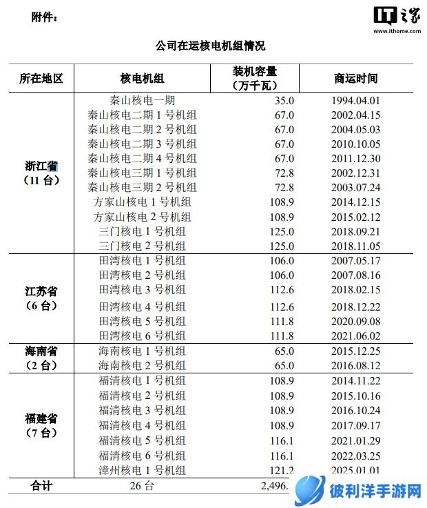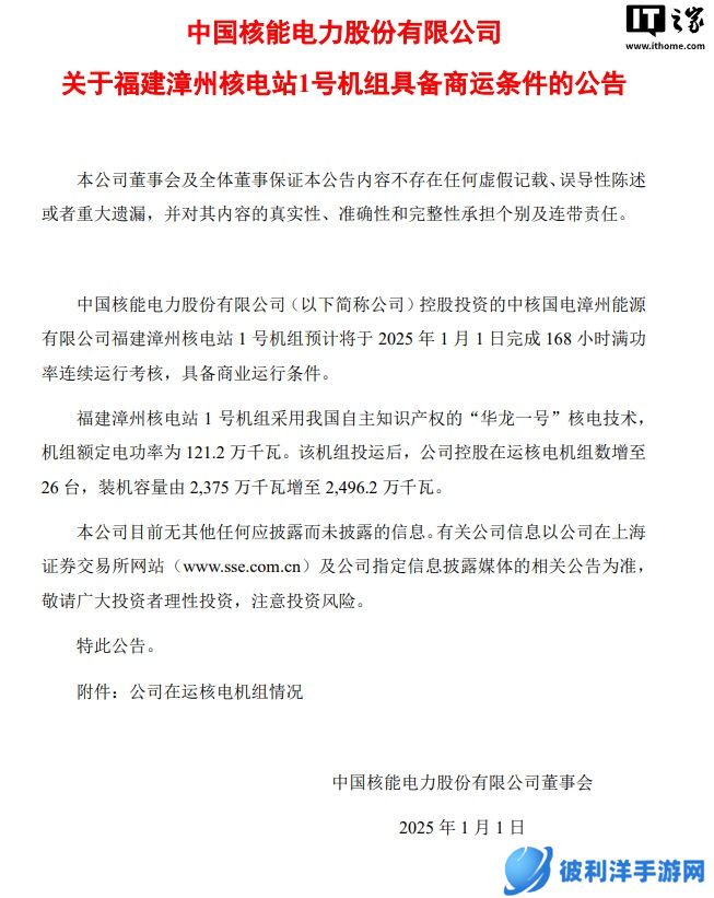 本站 12 月 31 日消息,中国核电刚刚发布公告,宣布中核国电漳州能源有限公司福建漳州核电站 1 号机组预计将于 2025 年 1 月 1 日完成 168 小时满功率连续运行考核,具备商业运行条件。