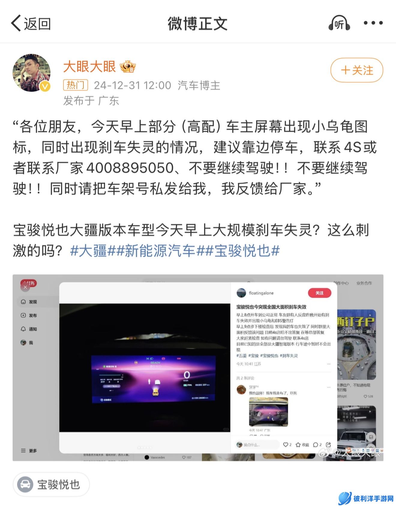 本站 12 月 31 日消息,据爱范儿报道,今天上午开始,在社交媒体上有多位车主反映自己的“宝骏悦也刹车失灵”。
