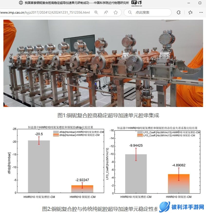 本站 1 月 1 日消息,据中国科学院近代物理研究所消息,由该所自主研制的我国首套铜铌复合腔高稳定超导加速单元成功通过各项测试研制成功,标志着我国面向高可靠应用的铜铌复合超导腔技术研究取得突破性进展。