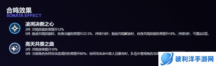 2件:共鸣技能伤害提升12%;5件:施放共鸣技能时,自身冷凝伤害提升22.5%,持续15秒;施放共鸣解放时,自身共鸣技能伤害提升18%,持续5秒,可叠加2层。